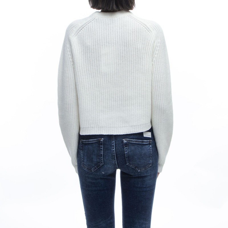 - Gerippter Kragen, Ärmelbündchen und Saum.