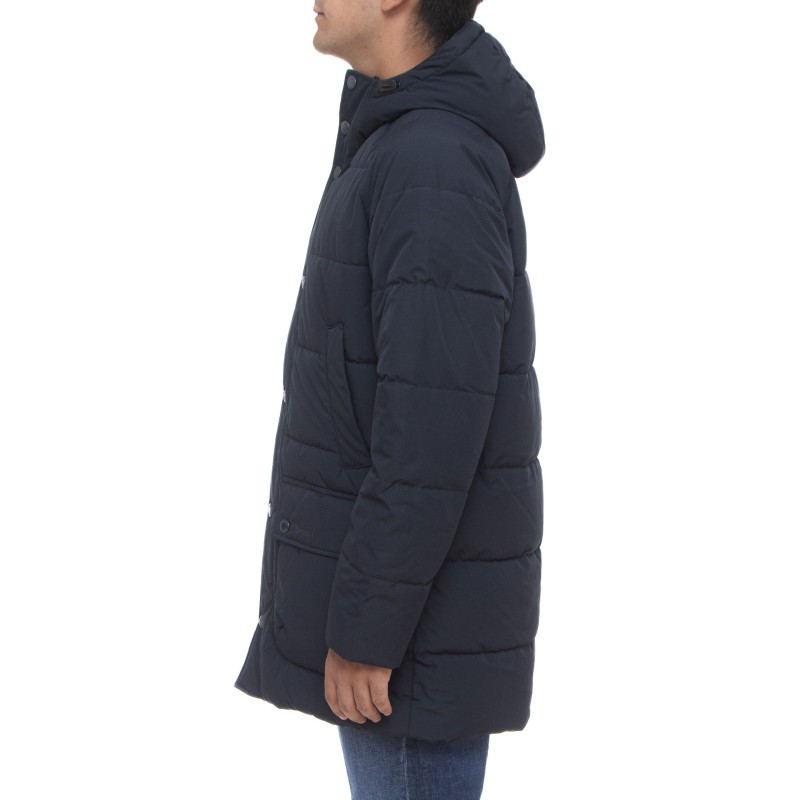 - Zentraler Zwei-Wege-Reißverschluss, der durch eine Klappe mit Clip-Knöpfen verdeckt wird.