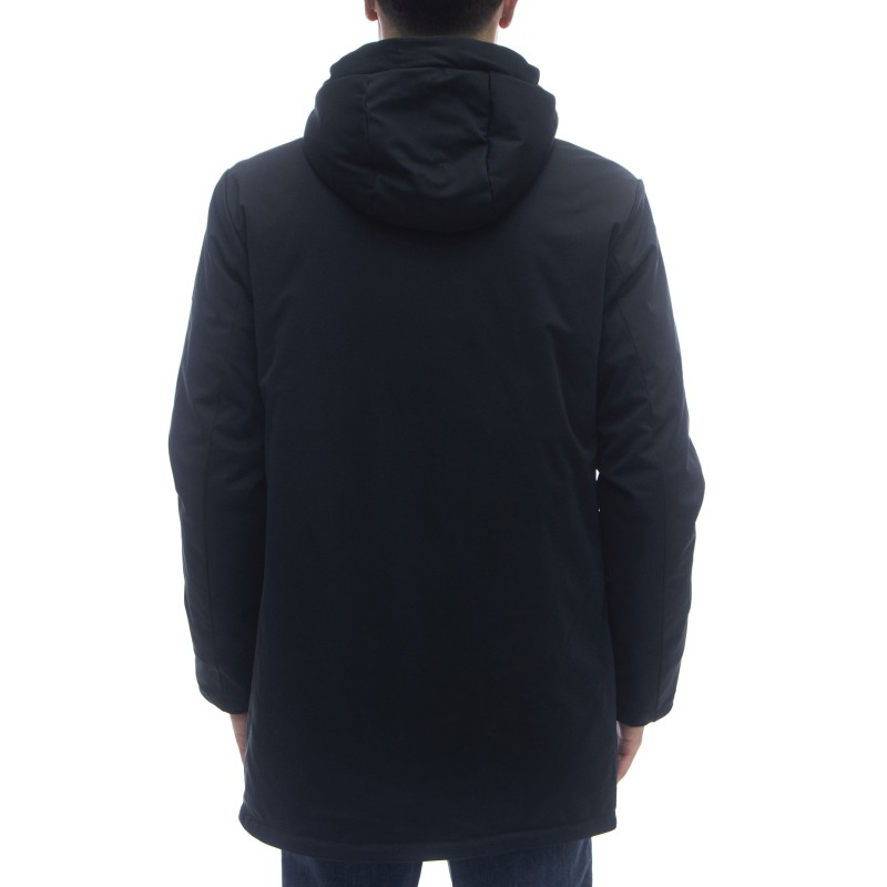- Piumino invernale lungo con cappuccio fisso con coulisse inserita.