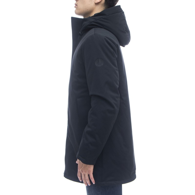 - 巾着が挿入された固定フード付きのロングウィンターダウンジャケット。